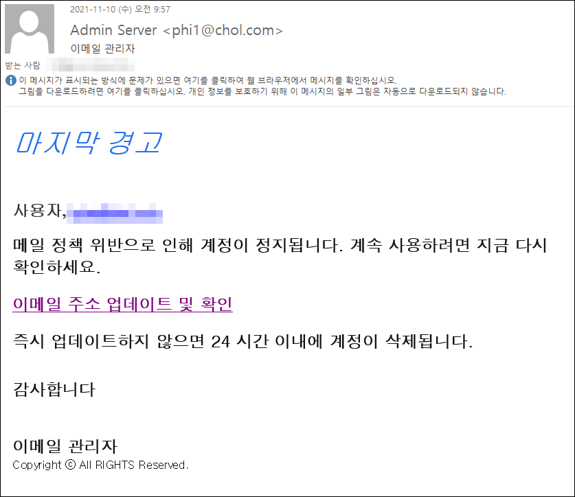상기 이메일과 첨부파일을 확인할 경우 주의가 필요합니다.