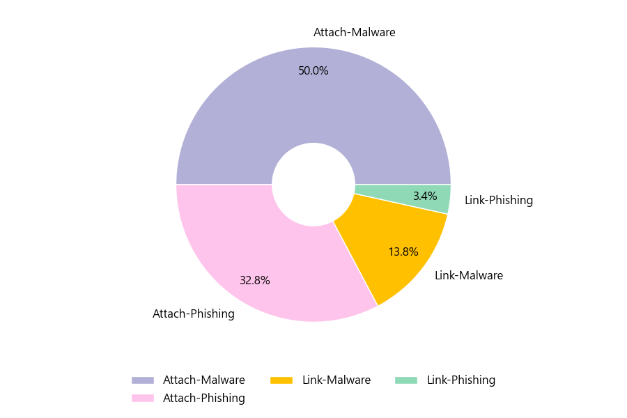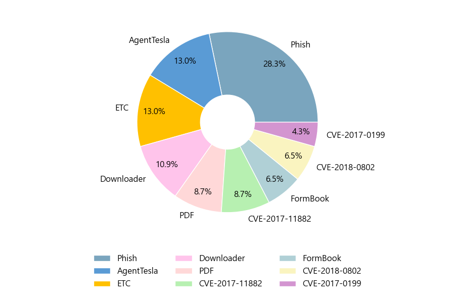 첨부파일은 ‘Phish’형태가 38.5%로 제일 큰 비중을 차지했고 뒤이어 ‘AgentTesla’, ‘CVE-2017-11882’가 각각 20.5%, 12.8%의 비중을 차지했습니다.
