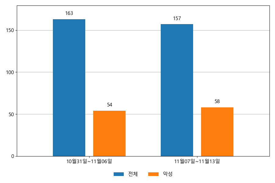 지난주 이메일 유입량은 총 163건이고 그중 악성은 54건으로 33.13%의 비율을 보였습니다. 악성 이메일의 경우 그 전주 51건 대비 54건으로 3건이 증가했습니다.