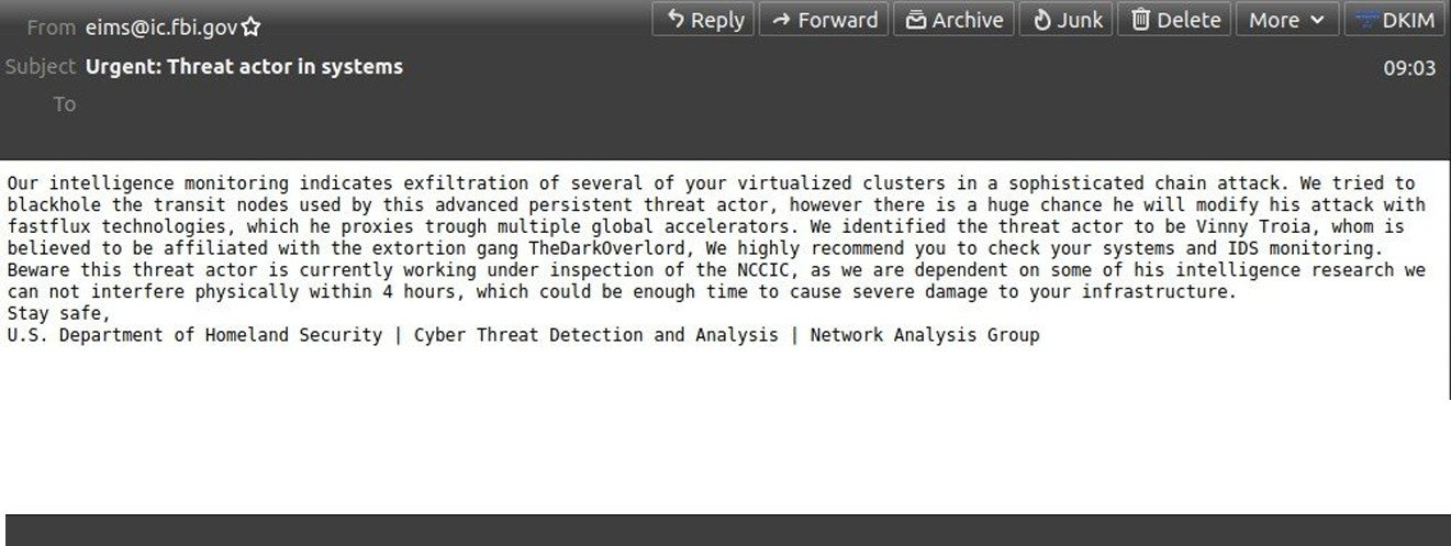 이번 주말, 미국 기업들은 FBI의 인프라에서 보낸 이메일을 수신하기 시작했습니다. 이메일은 수신자의 "가상화된 클러스터"가 "정교한 사슬 공격"의 타깃이 되고 있다고 경고했습니다.