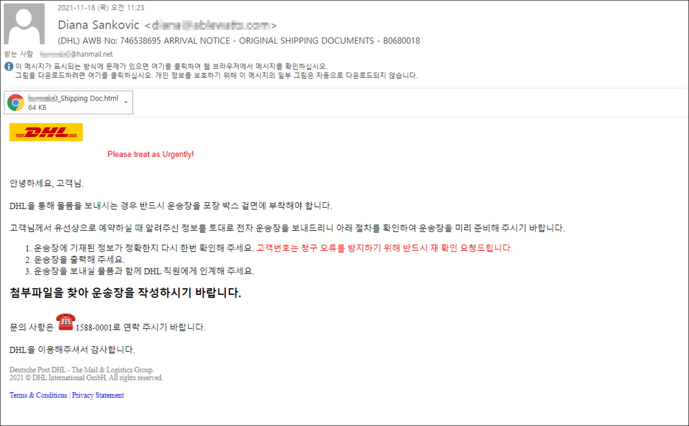 이번에 발견된 피싱 메일은 DHL을 위장하고 있습니다.