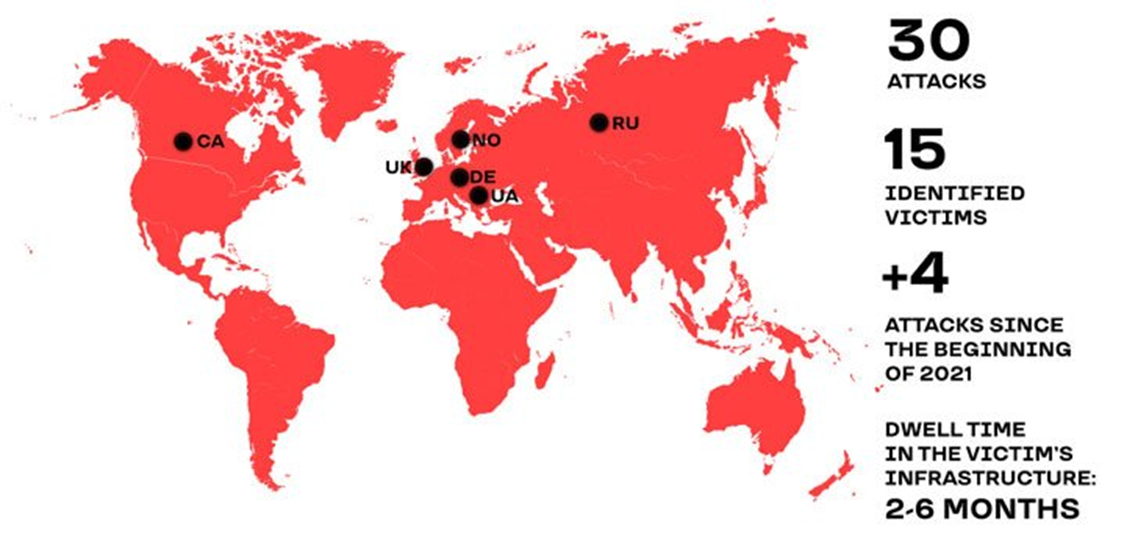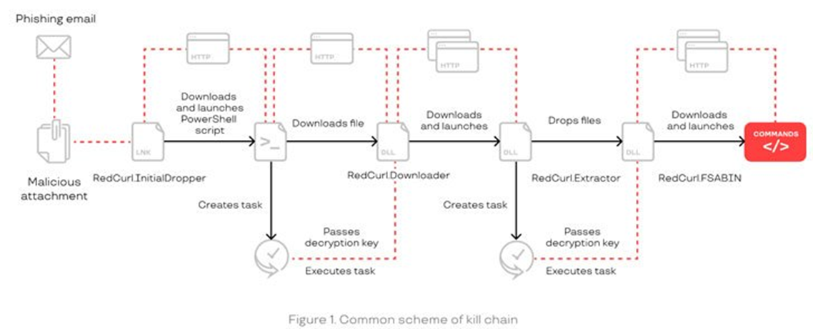 적어도 2018년 11월부터 활동을 시작한 러시아어를 구사하는 RedCurl 해킹 그룹은 기업 사이버 스파이 및 문서 탈취를 목적으로 영국, 독일, 캐나다, 노르웨이, 러시아, 우크라이나에 위치한 건설, 금융, 컨설팅, 소매, 보험, 법률 분야에 걸쳐 조직 14곳을 노린 공격 30건과 관련이 있습니다.
