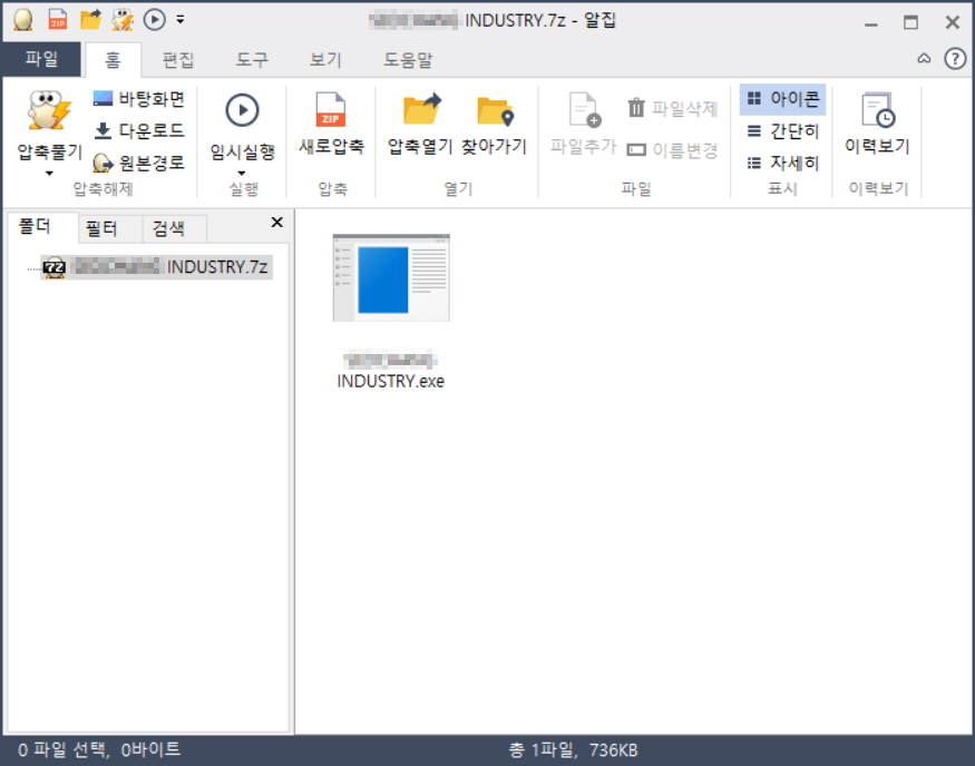 대용량 첨부파일은 .7z으로 압축되어 있으며, 압축파일 내에는 악성 .exe 파일이 포함되어 있습니다.