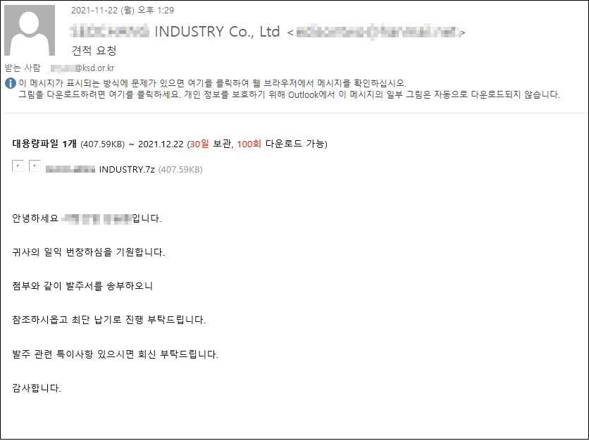 해당 피싱 메일은 발주서를 송부한다는 내용과 함께 대용량 파일이 첨부되어 있습니다.