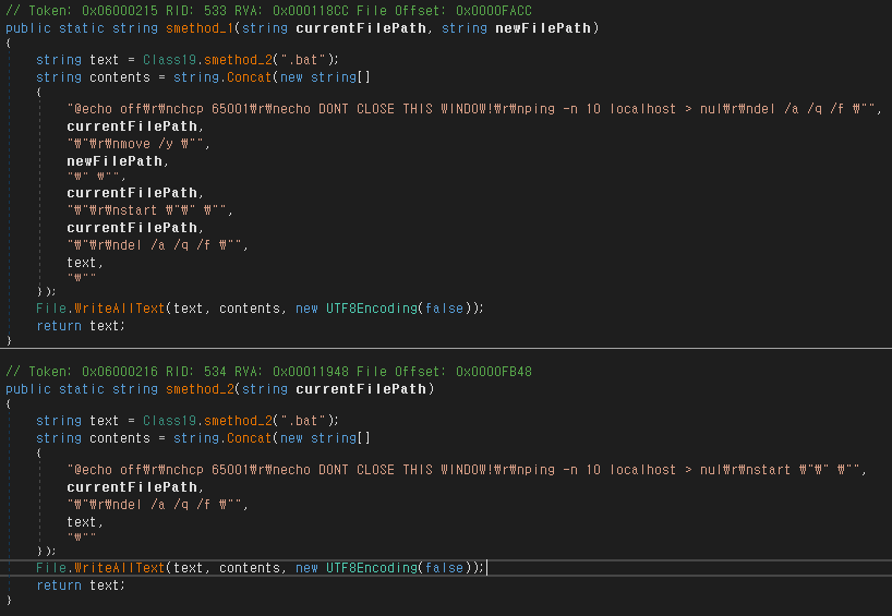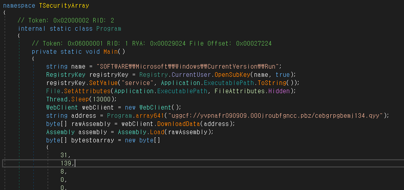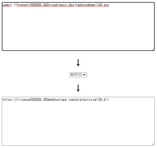 두 개의 파일은 모두 동일하게 rot13으로 암호화 되어 있으며, 실행 후 내부에 포함되어 있는 url 복호화 후 추가 dll 다운로드를 시도합니다. 하지만, ESRC 분석 시점에는 접속이 불가능하여 추가 확인이 불가하였습니다.
