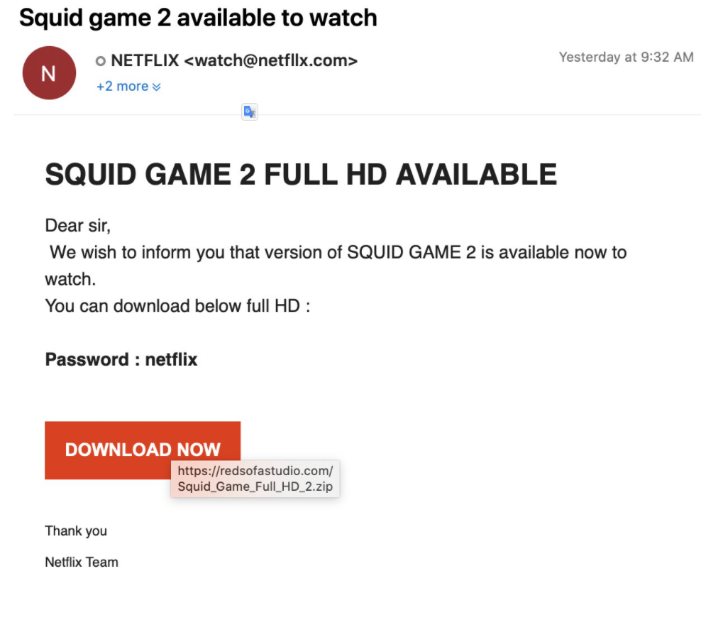 피싱 메일은 "Squid game 2 available to watch"라는 제목으로 유포중이며, Full HD를 다운로드 받을 수 있다며 다운로드 링크가 포함되어 있습니다.