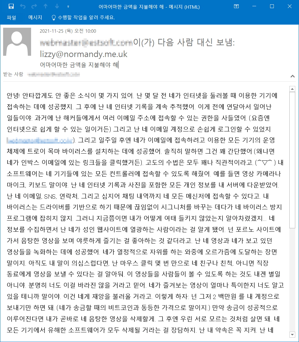 안녕! 안타깝게도 안 좋은 소식이 몇 가지 있어. 난 몇 달 전 네가 인터넷을 둘러볼 때 이용한 기기에 접속하는 데에 성공했지. 그 후에 난 네 인터넷 기록을 계속 추적했어. 이게 전에 연달아서 일어난 일들이야: 과거에 난 해커들에게서 여러 이메일 주소에 접속할 수 있는 권한을 사들였어. (요즘엔 인터넷으로 쉽게 할 수 있는 일이거든) 그리고 난 네 이메일 계정으로 손쉽게 로그인할 수 있었지 (******@**********). 그리고 일주일 후엔 네가 이메일에 접속하려고 이용한 모든 기기의 운영 체제에 트로이 목마 바이러스를 설치하는 데에 성공했어. 솔직히 말하면 그건 꽤 간단했어 (왜냐면 네가 인박스 이메일에 있는 링크들을 클릭했거든). 고도의 수법은 모두 꽤나 직관적이라고. (⁀▽⁀ ) 내 소프트웨어는 네 기기들에 있는 모든 컨트롤러에 접속할 수 있도록 해줬어. 예를 들면 영상 카메라나 마이크, 키보드 말이야. 난 네 인터넷 기록과 사진을 포함한 모든 개인 정보를 내 서버에 다운받았어. 난 네 이메일, SNS, 연락처, 그리고 심지어 채팅 내역까지 네 모든 메신저에 접속할 수 있다고. 내 바이러스는 드라이버를 기반으로 하기 때문에 끊임없이 시그니처를 바꾸는 데다가 네 바이러스 방지 프로그램에 잡히지 않지. 그러니 지금쯤이면 내가 어떻게 여태 들키지 않았는지 알아차렸겠지... 네 정보를 수집하면서 난 네가 성인 웹사이트에 열광하는 사람이라는 걸 알게 됐어. 넌 포르노 사이트에 가서 음탕한 영상을 보며 야릇하게 즐기는 걸 좋아하는 것 같더라고. 난 네 영상과 네가 보고 있던 영상들을 녹화하는 데에 성공했어. 네가 열정적으로 자위를 하는 와중에 오르가즘에 도달하는 장면 말이지. 아직도 내 말이 의심스럽다면, 난 마우스 클릭 몇 번 만으로 네 친구나 친척, 아니면 직장 동료에게 영상을 보낼 수 있다는 걸 알아둬. 이 영상들을 사람들이 볼 수 있도록 하는 것도 내겐 별일 아니야. 분명히 너도 이걸 바라진 않을 거라고 믿어. 네가 즐겨보는 영상이 얼마나 특이한지 너도 알고 있을 테니까 말이야. 이건 네게 재앙을 불러올 거라고. 이렇게 하자: 넌 그저 2백만원 를 내 계정으로 보내기만 하면 돼. (네가 송금할 때의 비트코인과 동등한 가격으로 말이지.) 만약 송금이 성공적으로 이루어진다면 내가 곧바로 네 음탕한 영상을 삭제할게. 그 후엔 우린 서로 모르는 것처럼 살면 돼. 네 모든 기기에서 유해한 소프트웨어가 모두 삭제될 거라는 걸 장담하지. 난 내 약속은 꼭 지켜. 난 네 프로필과 트래픽을 오래 관찰하면서 많은 노력을 쏟았기 때문에 이만하면 아주 싼 값에 해주는 거야. 비트코인을 어떻게 사고 보내는지 잘 모른다면 – 인터넷으로 관련 정보를 쉽게 찾을 수 있으니 한 번 해봐. 아래에 적힌 게 내 비트코인 지갑이야: 1GRunFgEGiLiKgmELuD3sWC8Mt2SWRaHb3 넌 이 메일을 열어본 시점으로부터 단 48시간 밖에 시간이 없어 (정확히 이틀). 이런 행동은 절대 시도하지 마: *내 메일에 답장하려고 하기 (네 인박스에 있는 이메일은 반송 주소와 함께 만들어진 주소야). *경찰이나 다른 보안 서비스를 부를 생각은 하지 마. 그리고 네 친구한테도 말할 생각 하지 마. 내가 그 사실을 알게 되면, (아주 쉽게 할 수 있지. 네 시스템을 모두 컨트롤하고 있으니 말이야) – 그 즉시 모든 사람들이 네 영상을 볼 수 있게 될거야. *날 찾으려는 시도는 하지 마 – 완전히 소용 없거든. 모든 가상화폐 거래는 언제나 익명으로 남아있다고. *네 기기에 있는 OS를 재설치하거나 제거하려는 시도도 하지 마. 네 모든 영상을 이미 근처 서버에 올려놨으니 그것도 아주 의미 없는 짓이라고. 이런 걱정은 하지 않아도 돼: *네가 보낸 돈을 내가 받지 못할 거라는 걱정. - 걱정 마. 난 아직도 네 모든 활동을 모니터링하고 있기 때문에 네가 송금을 성공적으로 마치면 그 돈을 추적할 수 있어. (내 트로이 목마 바이러스는 팀뷰어처럼 원격 제어 옵션이 포함되어있거든). *돈을 성공적으로 보낸 후에도 내가 네 영상을 공개할 거라는 걱정. - 날 믿어, 계속해서 네 인생을 복잡하게 만드는 건 내게 아무 의미도 없다고. 내가 그걸 바랬다면 진작에 했겠지! 모든 건 공정하게 진행될 거야! 깜빡할까 봐 말해주는데...이런 일에 다시는 휘말리지 않도록 해! 내가 해주는 조언이야 – 네 계정 비밀번호를 주기적으로 바꿔주라고.