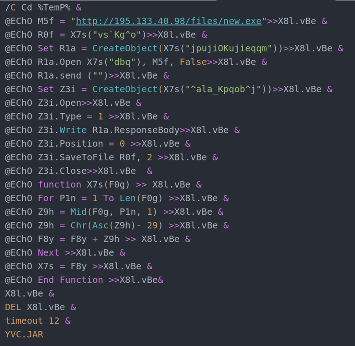 로더가 실행되면 VBScript 파일을 %TEMP% 폴더에 쓰고, 해당 파일을 실행하여 악성코드(RAT) 페이로드를 다운로드합니다.