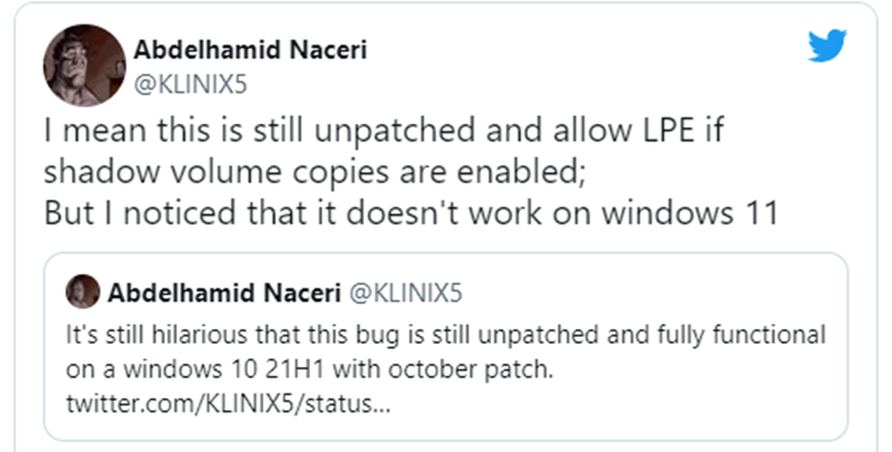 Naceri는 해당 취약점이 아직 해결되지 않았으며, 권한 상승에 악용될 수 있다고 제보했습니다.