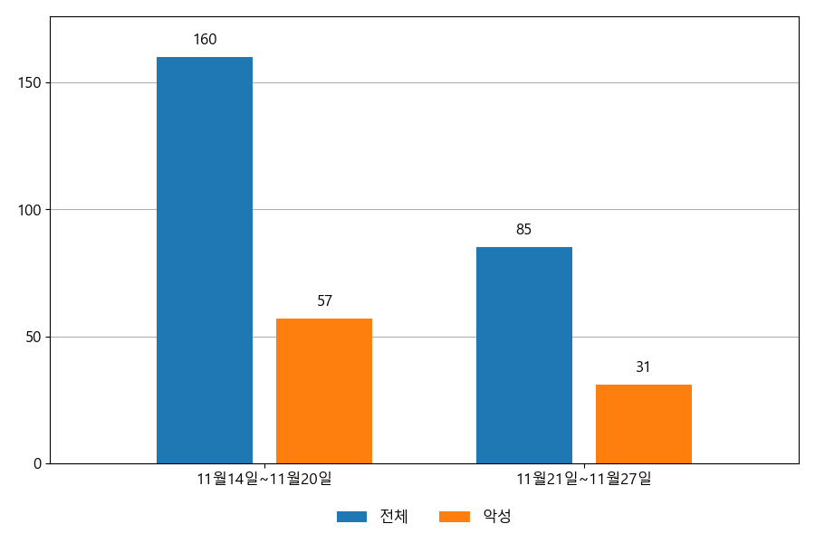 ESRC에서는 자체 운영 중인 이메일 모니터링 시스템의 데이터를 통해 이메일 중심의 공격이 어떻게 이루어지고 있는지 공유하고 있습니다. 다음은 11월 21일~11월 27일까지의 주간 통계 정보입니다.
