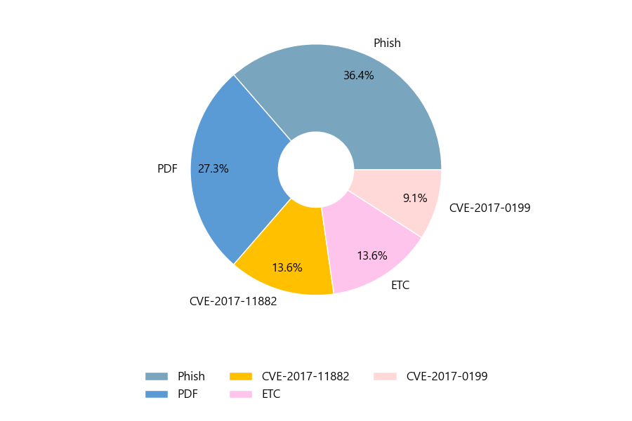 첨부파일은 ‘Phish’형태가 36.4%로 제일 큰 비중을 차지했고 뒤이어 ‘PDF’, ‘CVE-2017-11882’가 각각 27.3%, 13.6%의 비중을 차지했습니다.