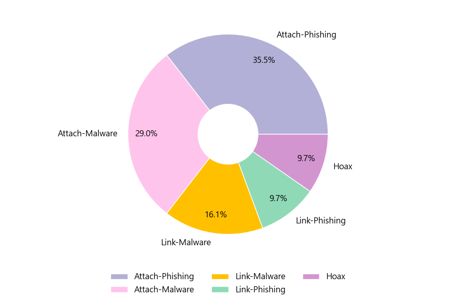 악성 이메일을 유형별로 살펴보면 31건 중 Attach-Phishing형이 35.5%로 가장 많았고 뒤이어 Attach-Malware형이 29.0%를 나타냈습니다.