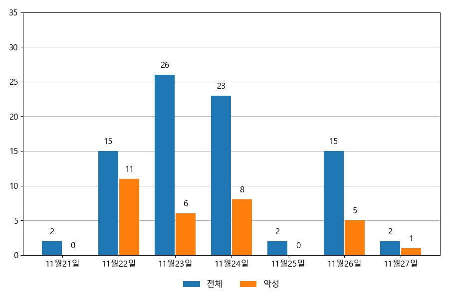 일일 유입량은 하루 최저 2건(악성 1건)에서 최대 26건(악성 11건)으로 일별 편차를 확인할 수 있습니다.