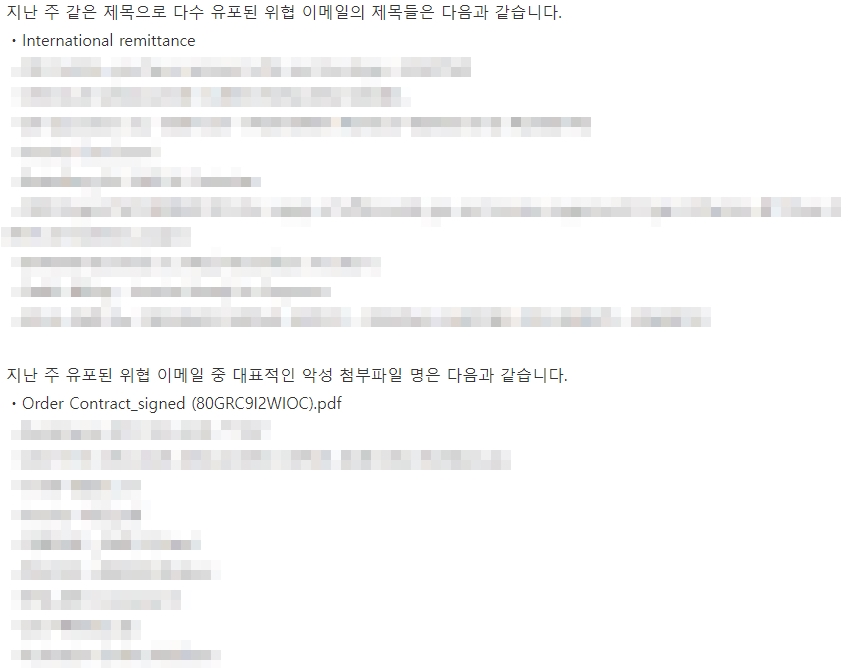이번주 Pick으로는 지난주 많이 유포된 Hoax 이메일을 선정했습니다. Hoax형 이메일의 경우 그동안 꾸준히 유포되었지만 일반인 대상으로 대량 유포되며 여전히 위협이 되고 있습니다. 이메일 확인시 상기 내용으로 가상화폐(코인)을 요구하는 경우 거짓된 내용을 포함하고 있으니 주의를 기우려야겠습니다. 자세한 내용은 다음 글을 확인하시기 바랍니다.
