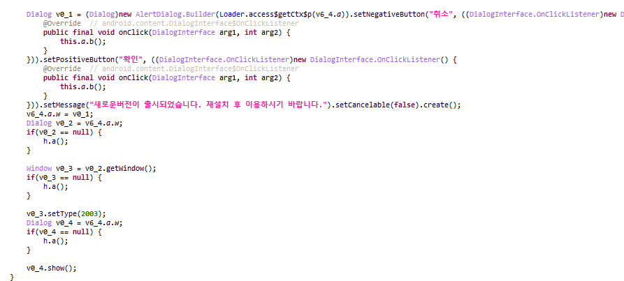 뿐만 아니라, 앱 코드 내부에는 본인인증 문구와 최신버전 업데이트의 문구가 있는 것으로 보아, 공격자가 추가적으로 본인인증을 이유로 계정정보 탈취 및 최신버전 업데이트의 이유로 추가 악성앱을 내려줄 가능성이 다분합니다.