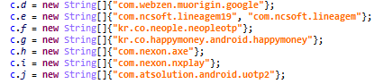 특이한 점은, 사용자 모바일 내 저장되어 있는 뮤오리진, 리니지M, 네오플OTP, 해피머니, 액스, 넥슨 플레이 등등 게임관련 계정정보를 탈취합니다.
