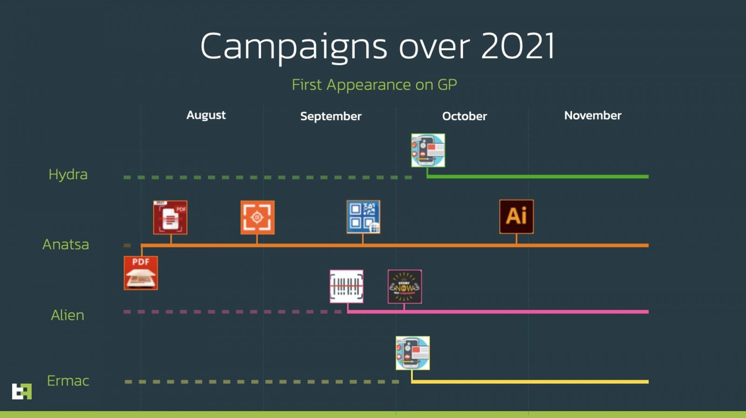 ThreatFabric은 2021년 7월부터 서로 다른 앱 16개를 통해 뱅킹 트로이 목마인 'Alien', 'Hydra', 'Ermac', 'Anatsa'를 배포하는 가짜 앱을 발견했습니다.