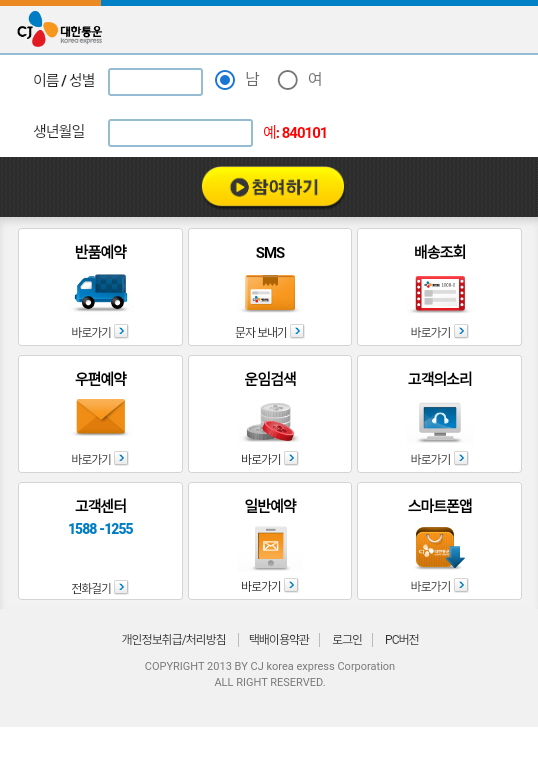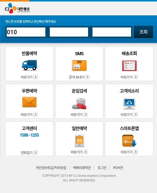 사용자가 스미싱 내 링크를 클릭하면 대한통운을 위장한 피싱 페이지로 이동합니다.