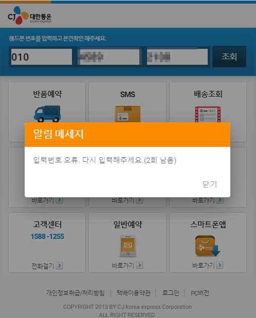 하지만기존과 다르게 입력한 번호를 검증하는 로직이 추가되었으며, 분석을 위하여 임의의 번호를 입력하면 다시 입력하라는 창을 띄웁니다. 번호는 총 3번 입력할 수 있으며, 만일 3번 모두 오류 발생 시 자동으로 실제 cj 사이트로 리디렉션 됩니다.