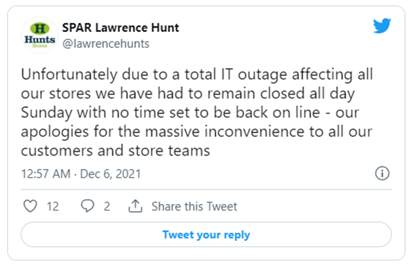 카운티 전역에 25개의 지점을 운영하는 Lawrence Hunt & Co Ltd는 이 사고가 현금 서랍, 신용 카드, SPAR의 네트워크 전반의 백오피스 시스템에 영향을 미쳤다고 밝혔습니다.