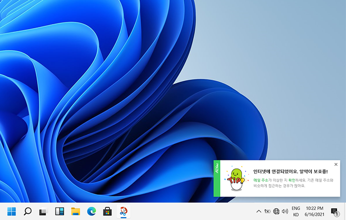 기존에는 단순히 인터넷 연결이 되었음을 안내하는 내용이었다면, 위와 같이 개선된 팝업을 통해서는 ‘다운로드 받은 파일의 악성 여부를 감시하고 있어요’, ‘악성코드에 의해 호스트 파일이 변조되면 알약은 사용자에게 바로 알려줘요’ 와 같은 문구를 통해 내 PC가 어떻게 보호받고 있는지 확인할 수 있습니다.