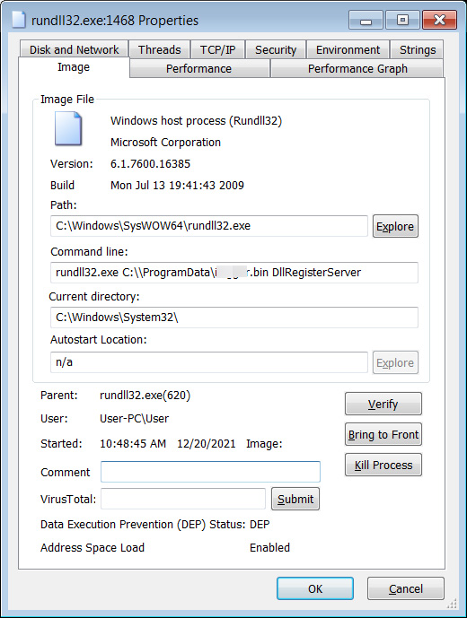 <Windows에서 Dridex DLL을 로드하는 Rundll>