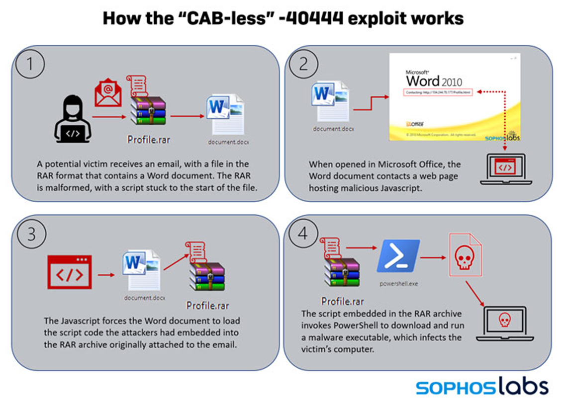수정된 익스플로잇인 CAB-less 40444는 10월 24일부터 25일까지 총 36시간 동안 지속되었으며, 해당 기간 동안 악성 RAR 압축 파일이 포함된 스팸 이메일이 잠재적 피해자에게 전송되었습니다. RAR 파일에는 WSH(Windows Script Host)로 작성된 스크립트와 오픈할 경우 악성 JavaScript를 호스팅하는 원격 서버에 접속하는 워드 문서가 포함되어 있습니다.