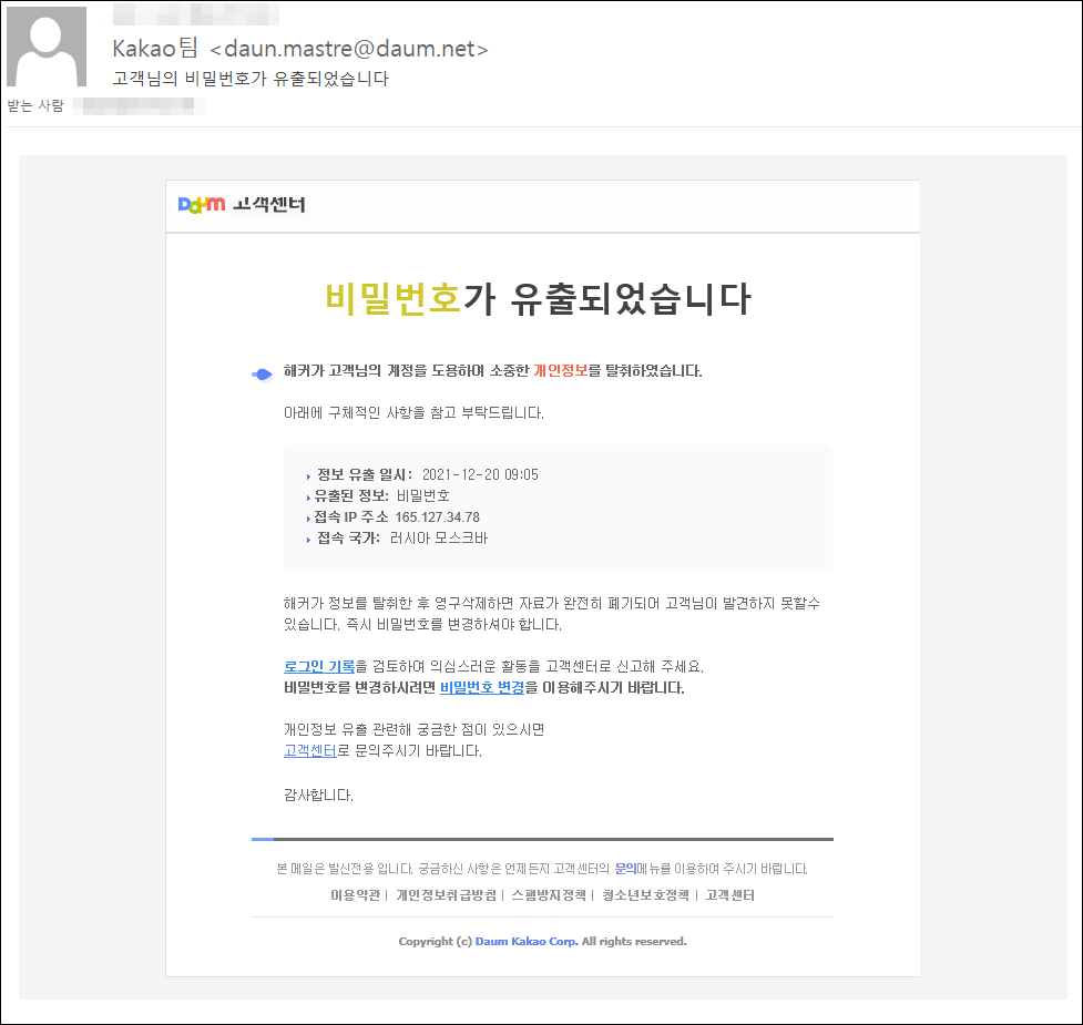 | 카카오 계정 이용자 보호상태를 위장한 피싱 메일 주의! (0) | 2022.01.07 |