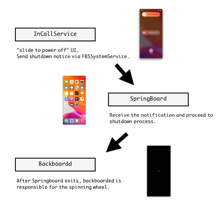 즉, 사용자가 측면 버튼과 볼륨 버튼 중 하나를 동시에 길게 누르고 "밀어서 전원 끄기"를 드래그할 경우 활성화되는 이벤트를 하이재킹해 기기가 실제로 종료되지는 않지만 종료되는 것처럼 위장합니다.