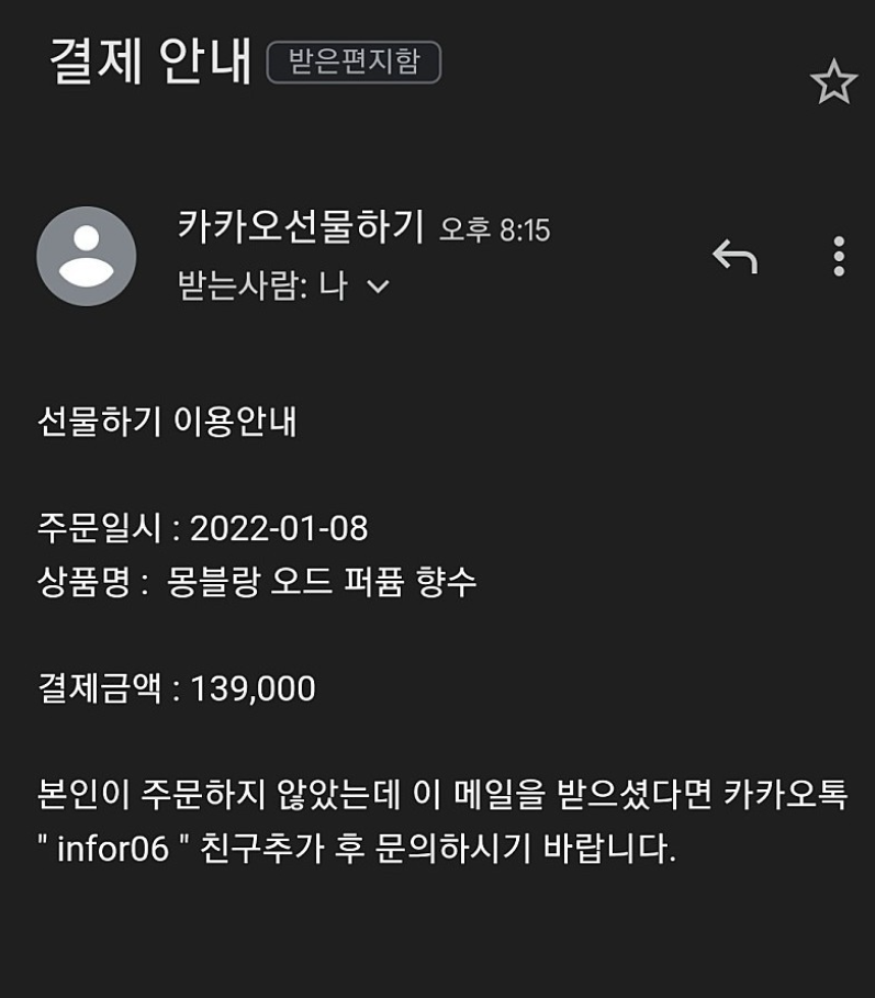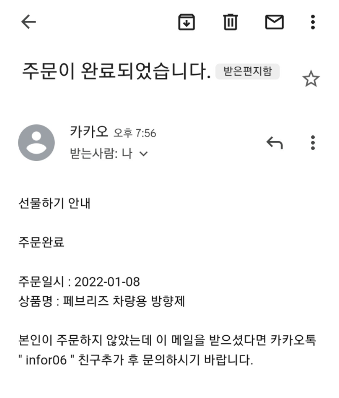 '주문이 완료되었습니다', '결제 안내' 등의 메일 제목으로 유포되며, 이메일에는 선물하기로 특정 상품이 결제되었으며 본인이 주문하지 않았다면 카카오톡 친구추가 후 문의를 하라며 이메일 내에 포함되어 있는 아이디로 친구추가를 유도합니다.