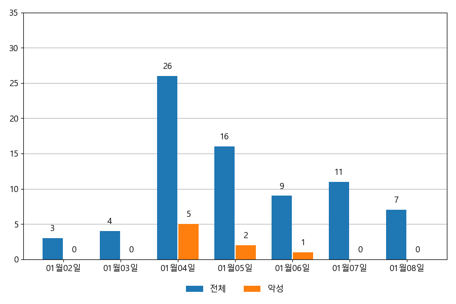 일일 유입량은 하루 최저 3건(악성 1건)에서 최대 26건(악성 5건)으로 일별 편차를 확인할 수 있습니다.