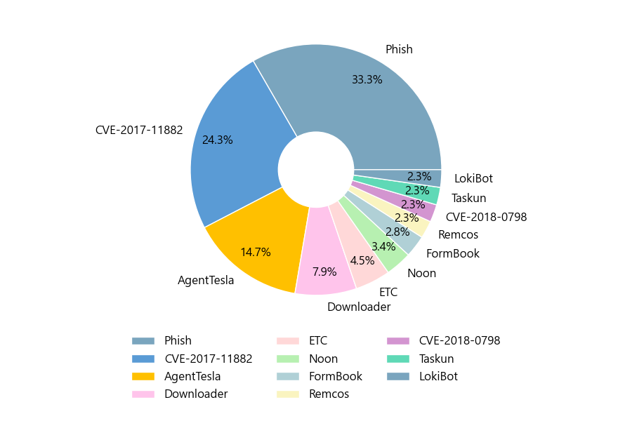 첨부파일은 ‘Phish’형태가 33.3%로 제일 큰 비중을 차지했고 뒤이어 ‘CVE-2017-11882’, ‘AgentTesla’가 각각 24.3%, 14.7%의 비중을 차지했습니다.