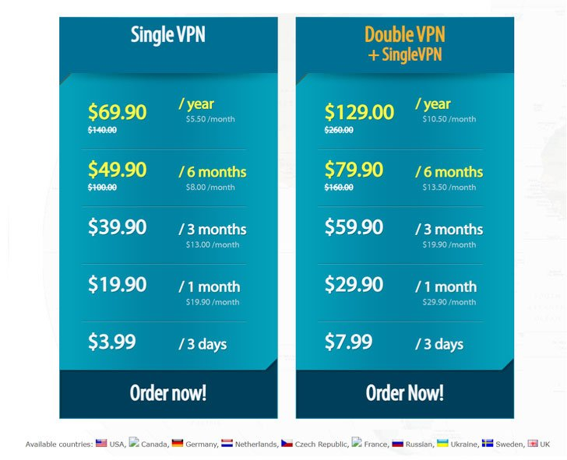 2008년에 설립된 이 회사는 고객에게 이중 VPN 연결을 제공함으로써 고급 수준의 익명성을 제공했습니다. 인터넷 트래픽은 한 대가 아닌 다른 국가에 있는 두 대의 VPN 서버를 통해 라우팅되며 가격은 1년에 60달러로 매우 저렴합니다.