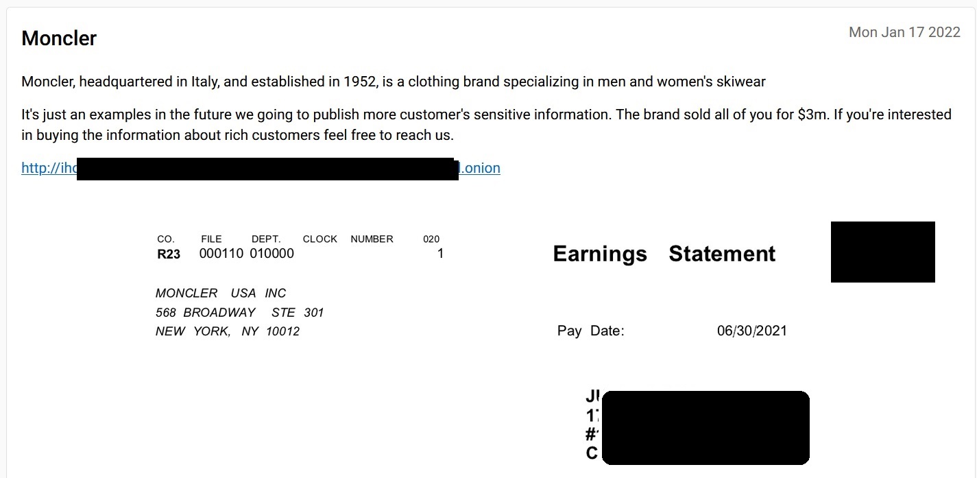 몽클레어(Moncler)가 12월에 공격을 받은 이후 데이터 유출되었다고 밝혔습니다. 이 명품 패션 기업은 AlphV/BlackCat 랜섬웨어의 공격을 받았으며, 오늘 Tor 네트워크 내 유출 사이트에 도난당한 데이터가 게시되었습니다.