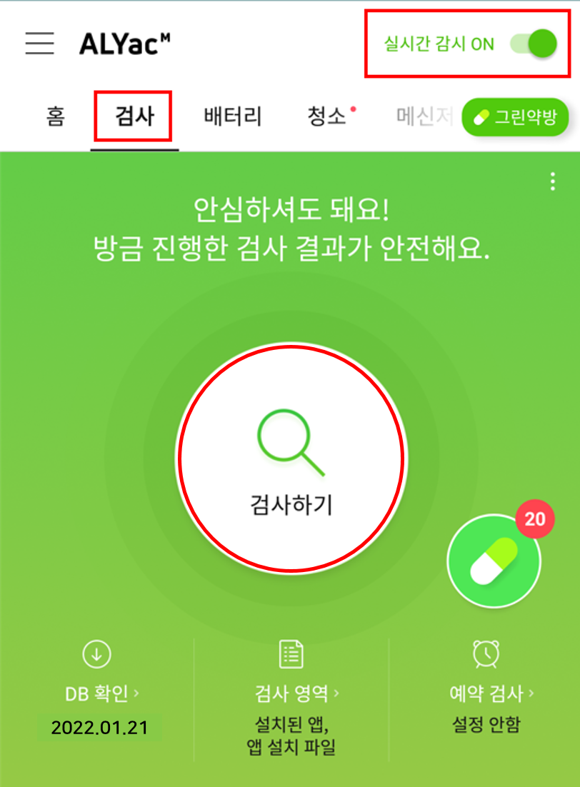 이러한 방법 외에 다운로드나 접근하는 모든 앱·파일을 실시간으로 감시할 수 있는 모바일 백신 알약M 실시간 감시 기능을 사용하면 큐싱(Qshing) 과 같은 사이버 피싱 범죄를 방지하는 데 큰 도움이 될 수 있습니다.