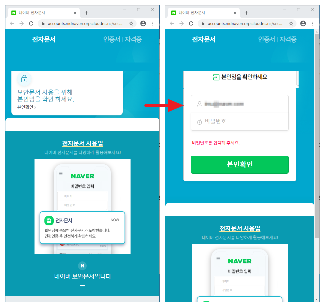 하지만 첨부 파일을 클릭해도 문서는 전혀 받아지지 않고, 마치 중요한 전자문서 인증용 보안 화면처럼 꾸며진 특정 웹 사이트를 보여주고, 이메일의 비밀번호를 입력해야 전자문서를 볼 수 있는 것처럼 현혹합니다. 만약 이곳에 비밀번호를 입력하면 통역사 계정 정보가 외부로 은밀히 유출됩니다.