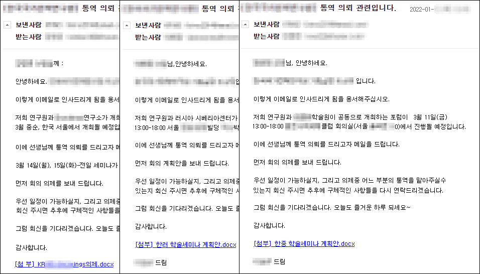공격자는 행사 일정에 참여가 가능한지 여부를 먼저 묻고, 그 다음 첨부된 문서 내용 중 어느 부분의 통역을 맡아줄 수 있는지 회신을 요구하며 자연스럽게 첨부 문서 내용을 클릭하도록 유도했습니다.