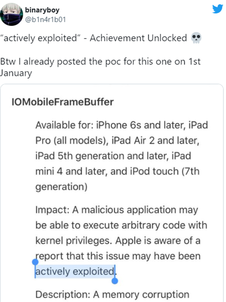 “악성 애플리케이션은 커널 권한으로 임의의 코드를 실행할 수 있습니다. 애플은 이 문제가 실제 공격에 활발히 악용되었을 가능성이 있다는 제보를 받았습니다.”