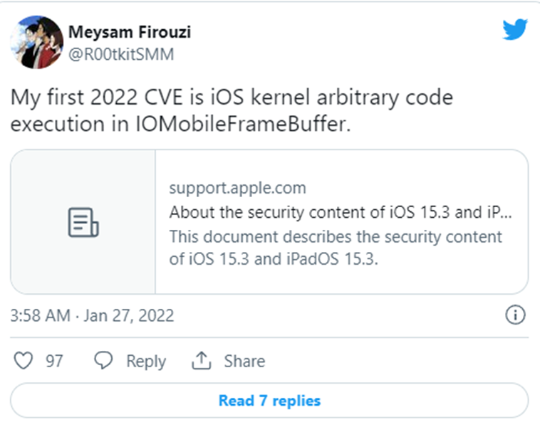 CVE-2022-22587로 등록된 이 제로데이 취약점 중 하나는 IOMobileFrameBuffer에 존재하며 iOS, iPadOS, macOS Monterey에 영향을 미치는 메모리 손상 이슈입니다.