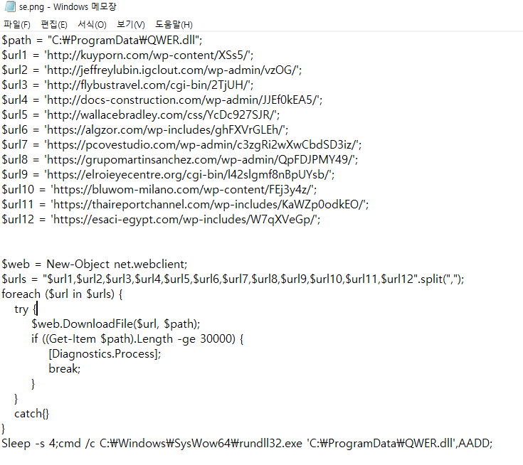 파워쉘 스크립트는 se.png 명의 파일을 내려받는데, 해당 파일은 .png 파일을 위장한 파워쉘 스크립트입니다. 해당 스크립트는 내려받음과 동시에 실행이 되며, 내부에 포함되어 있는 12개의 url 중에서 접속이 성공하는 주소에 접속하여 QWER.dll 파일을 내려받아 실행합니다.
