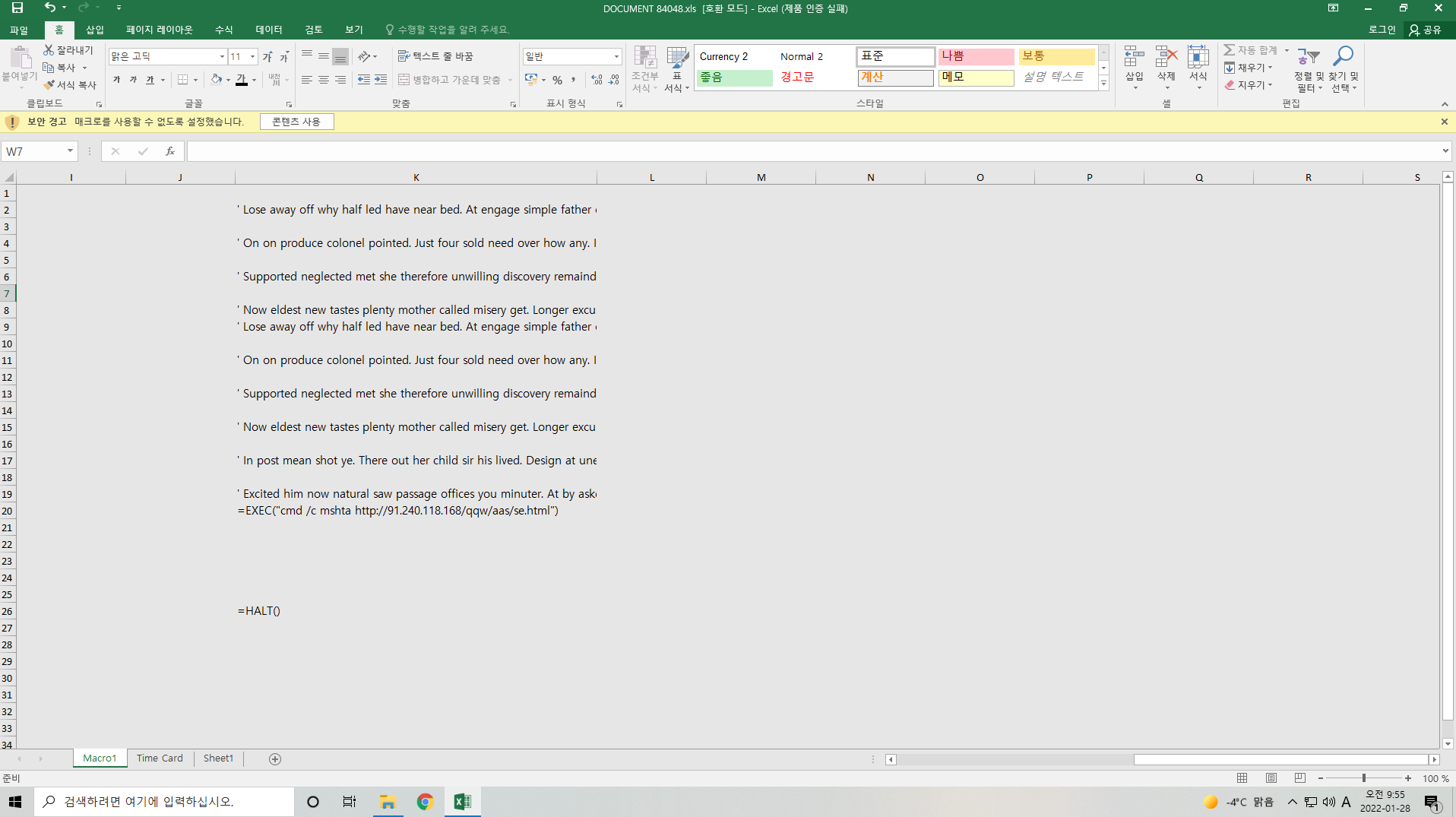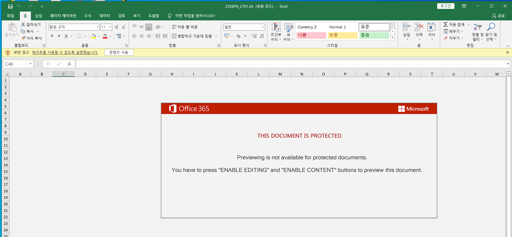 압축파일 내에는 매크로가 포함된 엑셀 파일이 포함되어 있으며, 문서가 보호되어있다며 사용자로 하여금 '콘텐츠 사용' 버튼의 클릭을 유도합니다.
