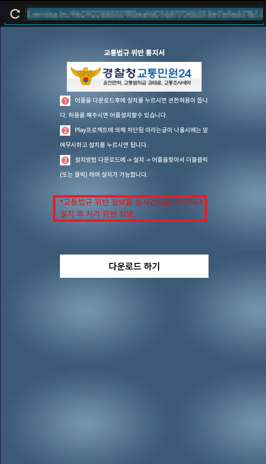 스미싱은 교통민원24를 위장하여 유포중이며, 법규위반, 과속운전 등의 내용과 함께 링크가 포함되어 있습니다. 문자메세지에 포함된 링크를 클릭하면 경창청 교통민원 24 페이지를 위장한 피싱페이지로 넘어갑니다.