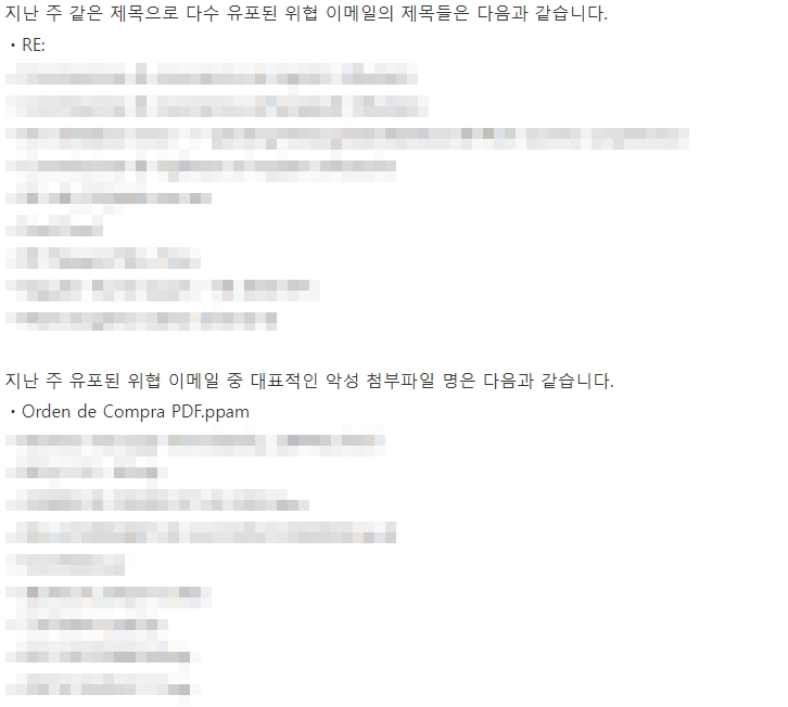 지난주 이메일 유입량은 총 126건이고 그중 악성은 55건으로 43.65%의 비율을 보였습니다. 악성 이메일의 경우 그 전주 48건 대비 55건으로 7건이 증가했습니다.