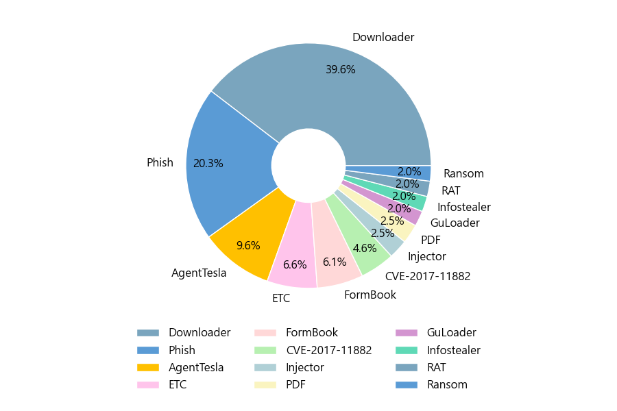 첨부파일은 ‘Downloader’형태가 39.6%로 제일 큰 비중을 차지했고 뒤이어 ‘Phish’, ‘AgentTesla’가 각각 20.3%, 9.6%의 비중을 차지했습니다.