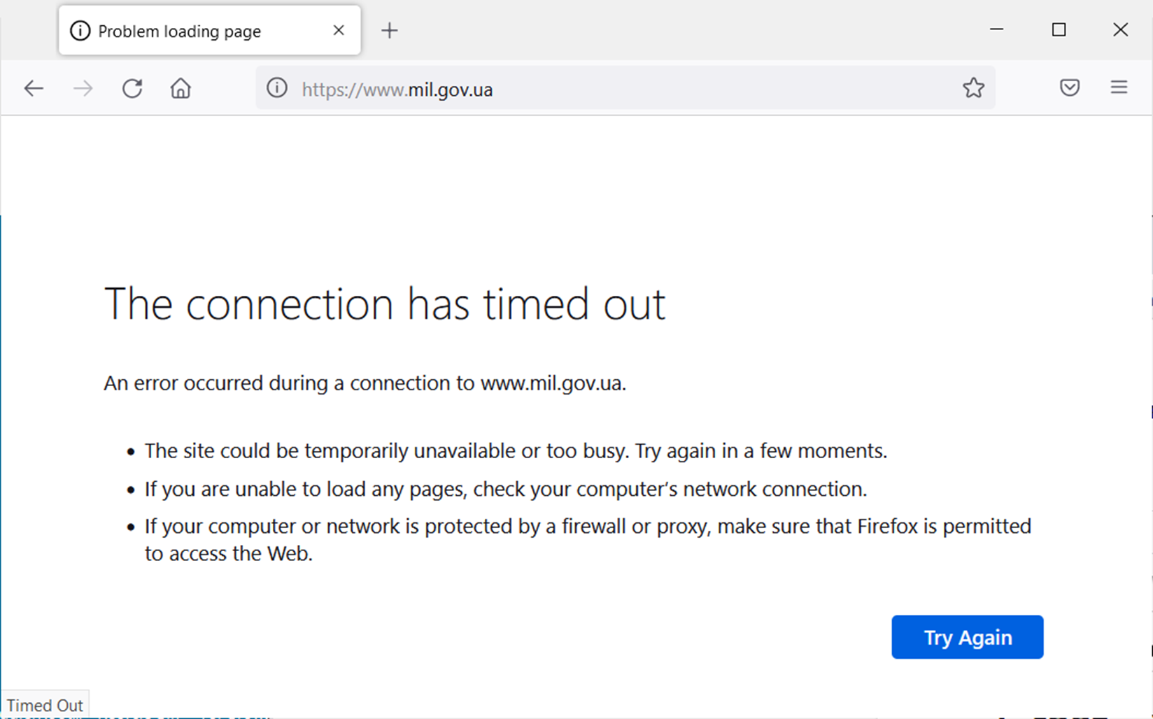 해당 공격을 받은 이후 사이트를 닫은 우크라이나 국방부는 "웹사이트가 DDoS 공격을 받았을 가능성이 있습니다. 초당 너무 많은 요청을 받은 기록이 발견되었습니다.”라 밝혔습니다.