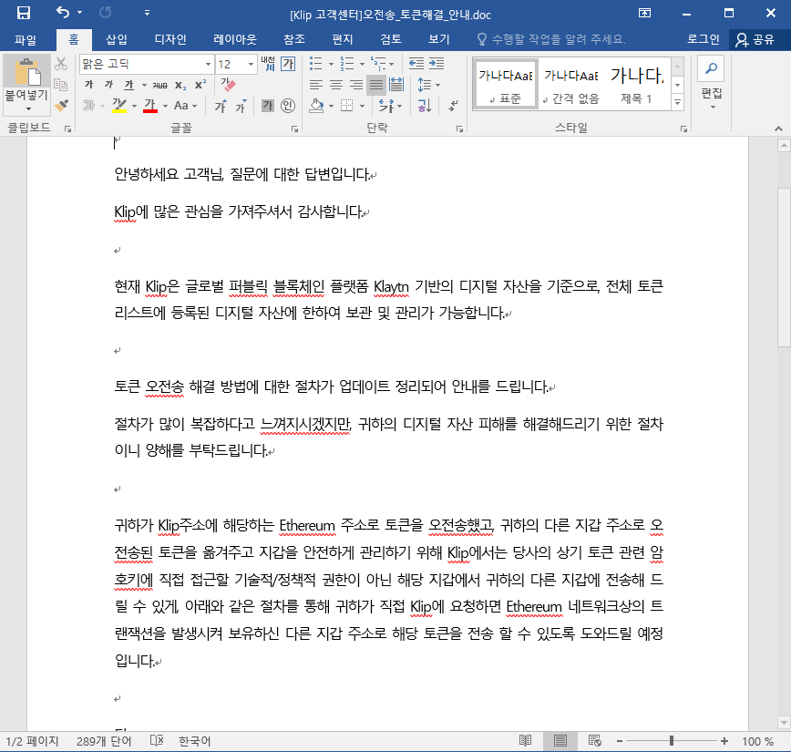 Klip은 카카오의 블록체인 관련 자회사인 그라운드 X가 개발한 디지털 자산 지갑 서비스로, 이번에 발견된 파일은 '[Klip 고객센터]오전송_토큰해결_안내.doc' 파일명으로 유포되었습니다.
