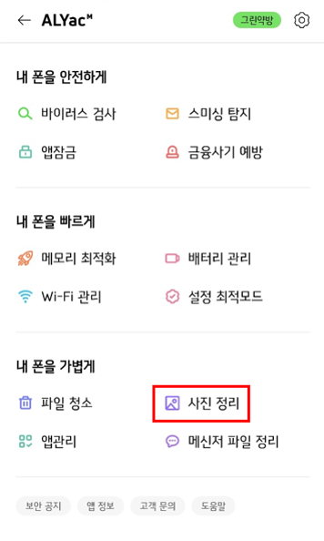② 알약M 좌측 상단 [전체 메뉴] > [내 폰을 가볍게] 탭에서도 찾아보실 수 있습니다.
