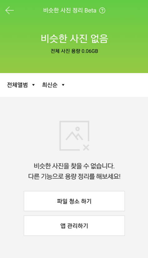 ⑤ 정리할 비슷한 사진이 없는 경우에는, [청소], [앱 관리] 등의 다른 기능을 사용해서 저장 공간을 확보해주세요!