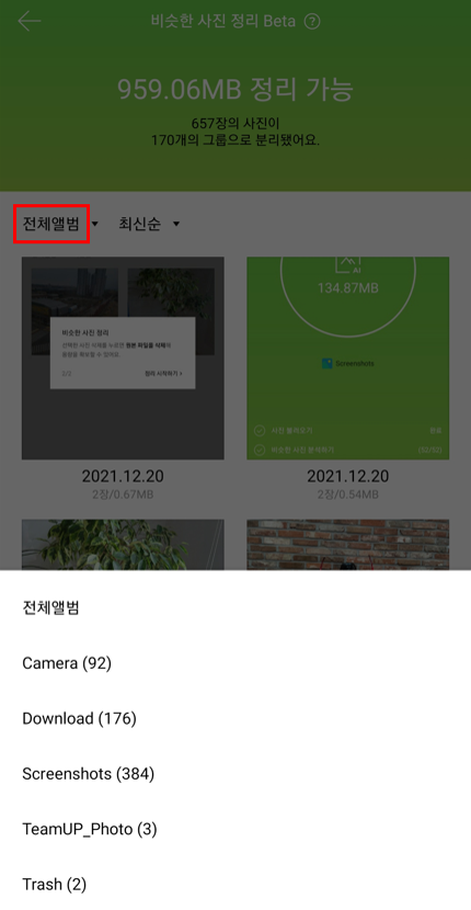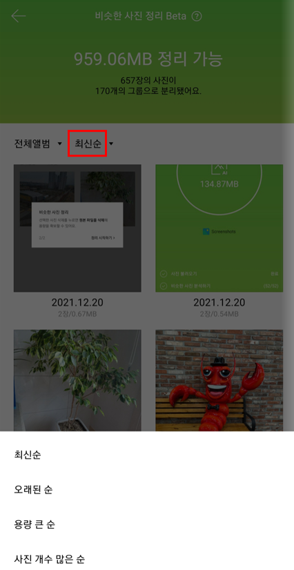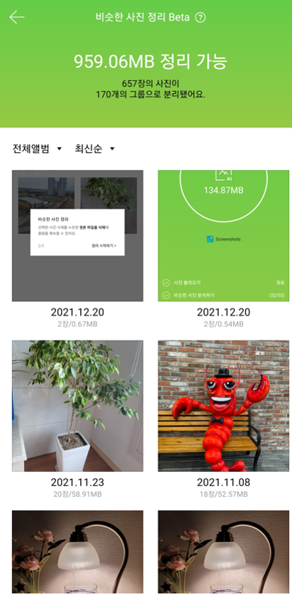 [전체앨범▼] 클릭시 정리된 모든 폴더를 확인할 수 있고, [최신순▼] 클릭시 폴더를 최신순/오래된 순/용량 큰 순/사진 개수 많은 순으로 정렬이 가능합니다. 그룹 내에서 전체 선택을 눌러 삭제를 진행하는 경우, AI가 추천하는 사진 1개를 제외하고 빠르게 사진을 정리할 수 있답니다.